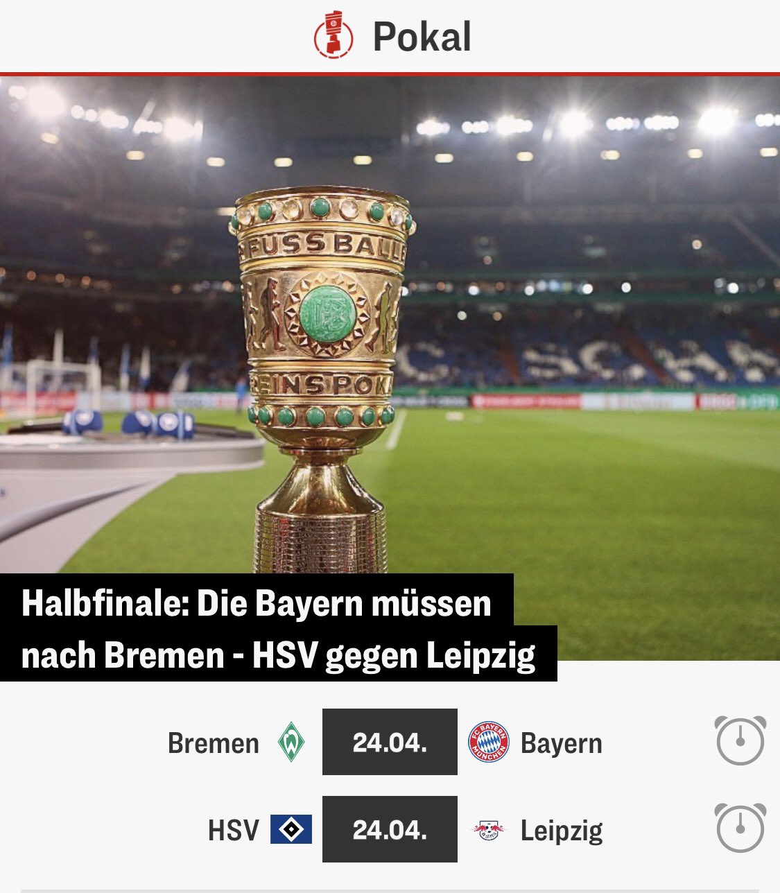 Zum Glück ist es nicht der Worst-Case geworden, sondern immerhin ein Heimspiel. Natürlich wäre mir Red Bull oder der Freilos-HSV daheim lieber gewesen. Aber man kann sich seine Gegner nun mal nicht aussuchen. Vielleicht gibt es nach langen, langen Jahren ja doch mal wieder ein „Wunder von der Weser“? Es wird also am 24. April der Finalgegner von Red Bull gesucht: Dass der FC Bayern natürlich großer Favorit ist, steht wohl außer Frage. Was meint Ihr dazu?
